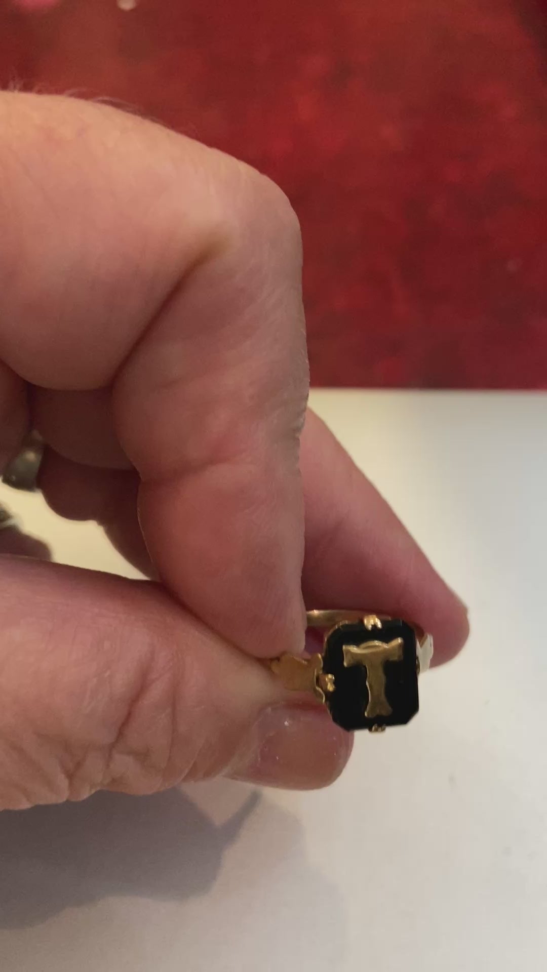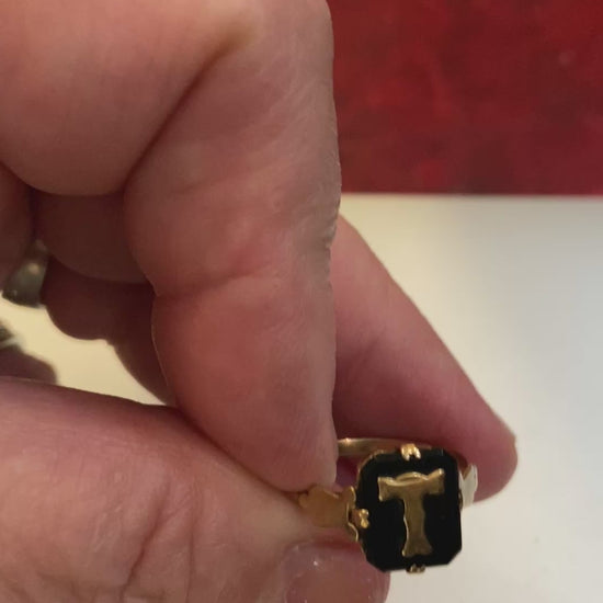 9ct vintage initial ring with the letter gothic T set in onyx,